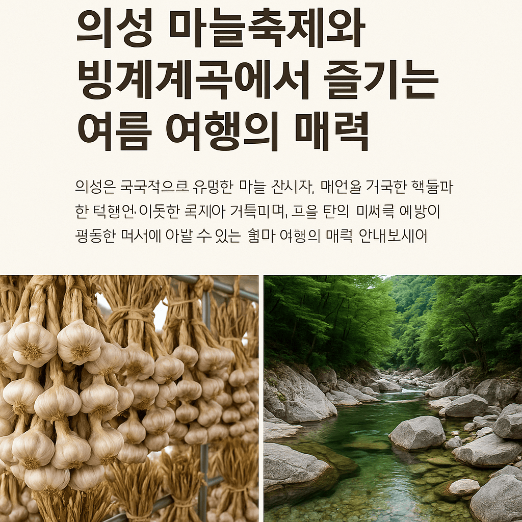 경북 의성은 ‘마늘의 고장’이라는 별명을 가진 만큼 전국적으로 우수한 품질의 마늘을 생산하는 지역입니다. 이곳에서는 매년 여름, 마늘을 테마로 한 축제가 성대하게 개최되며, 방문객들은 의성 마늘의 깊은 맛과 향을 다양한 방식으로 체험할 수 있습니다. 특히 의성 마늘축제는 단순히 먹거리를 즐기는 것을 넘어, 농가와 소비자를 직접 연결하고 지역 경제를 활성화하는 중요한 행사로 자리잡았습니다. 마늘을 주제로 한 요리 경연대회, 마늘 수확 체험, 마늘 건강 세미나 등 흥미로운 프로그램이 다채롭게 준비되어 있어 누구나 즐길 수 있는 축제입니다. 이와 함께 여름철 의성 여행에서 빠질 수 없는 명소가 바로 빙계계곡입니다. 빙계계곡은 이름 그대로 얼음처럼 차가운 물이 흐르는 계곡으로, 무더운 여름에도 한기를 느낄 수 있을 만큼 시원한 기온을 자랑합니다. 울창한 숲이 드리운 계곡 길을 따라 걷다 보면 맑은 물소리와 바람 소리가 어우러져 한 폭의 산수화를 연상케 합니다. 특히 계곡 입구에서부터 이어지는 평탄한 산책로와 기암괴석은 가족 단위 여행객과 사진 애호가들의 발길을 사로잡습니다. 의성 마늘축제와 빙계계곡 여행은 먹거리와 볼거리, 그리고 자연 속 휴식까지 모두 누릴 수 있는 완벽한 여름 여행 코스입니다. 이번 글에서는 이 두 명소의 매력을 깊이 있게 살펴보고, 여행을 계획하는 데 필요한 실질적인 정보와 꿀팁을 제공하겠습니다. 마늘 향이 가득한 축제 현장과 얼음처럼 시원한 계곡의 풍경 속으로 함께 떠나보겠습니다.